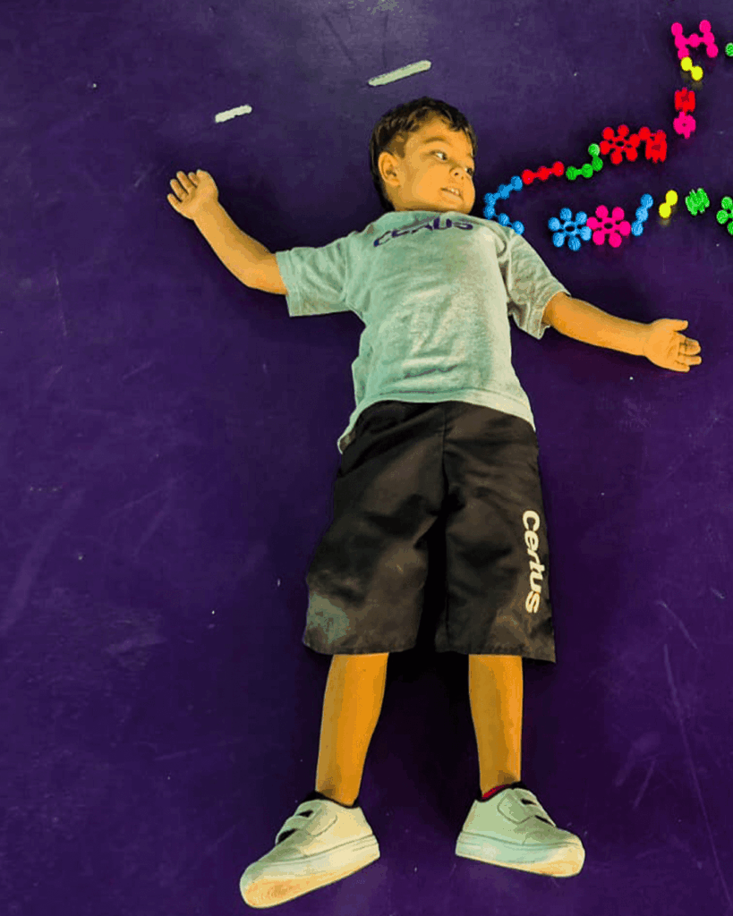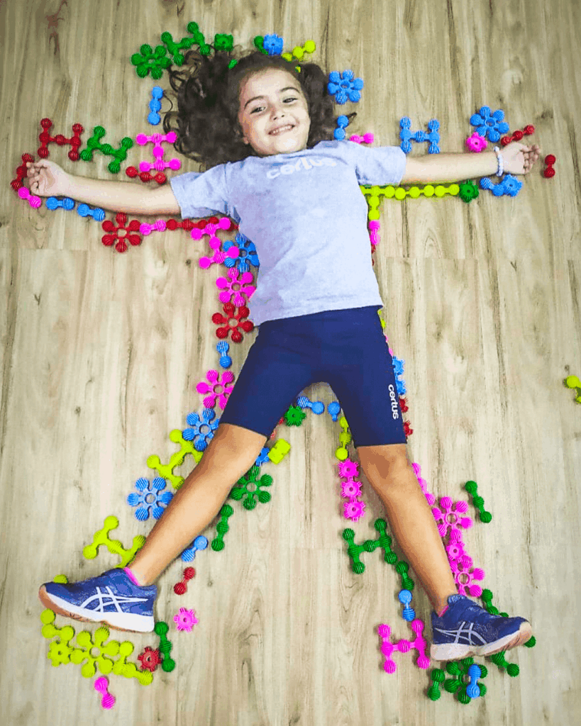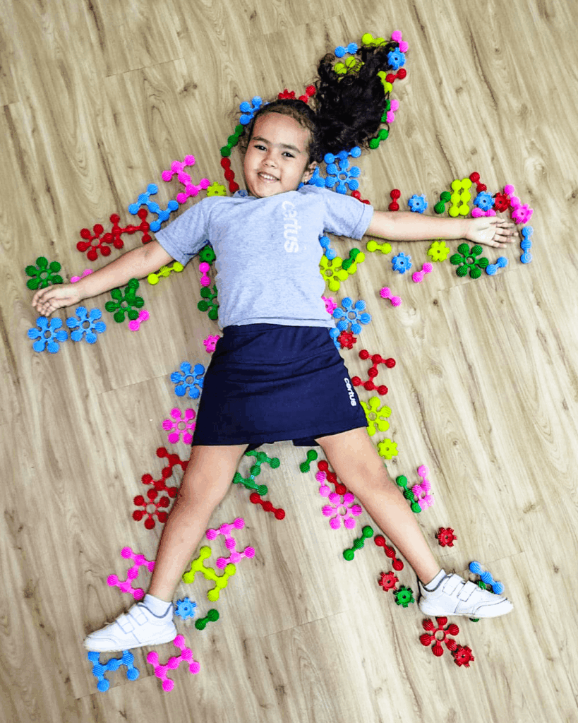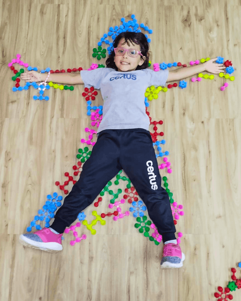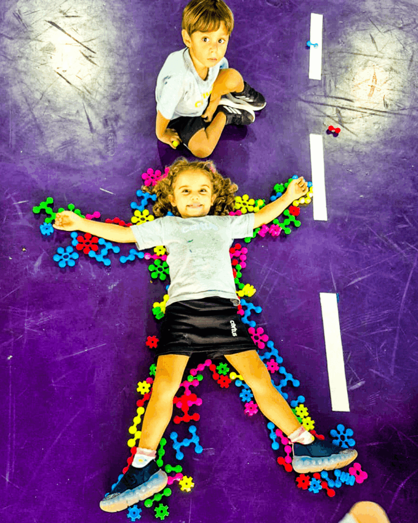 Durante a proposta, uma criança se deitava no chão enquanto um colega contornava seu corpo com pequenas peças, formando um molde corporal. Mais do que um simples desenho no chão, a atividade permitiu que as crianças visualizassem o corpo inteiro e percebessem tamanhos, proporções, posições e relações espaciais.